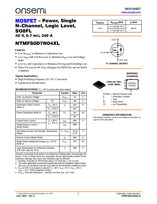 Power MOSFET, Single, N-Channel, 40V, 0.7mΩ, 349A, SO8-FL 5x6
