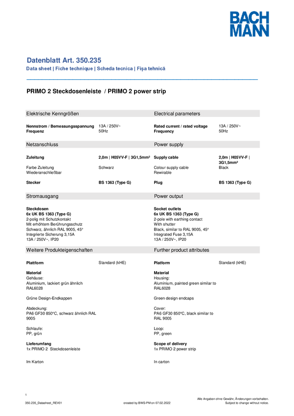 Listwa zasilająca Bachmann 350235 350235 Ilość gniazdek: 6
