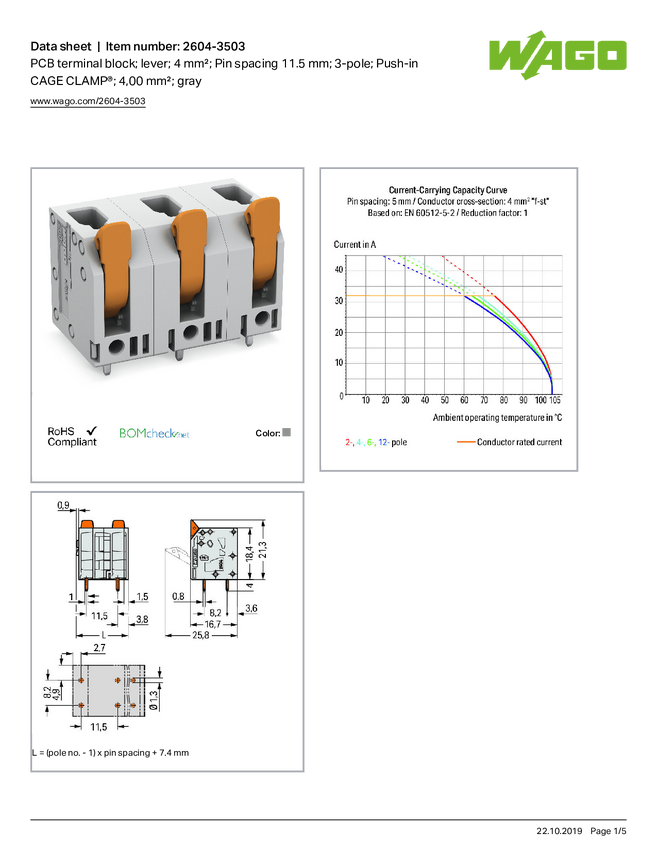 WAGO 2604-3503 Terminal PCB 4 mm² Ilość styków 3 1 szt.