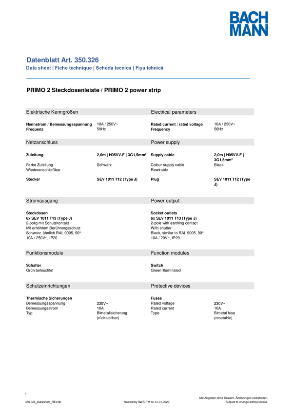 Listwa zasilająca Bachmann 350326 350326 Ilość gniazdek: 6