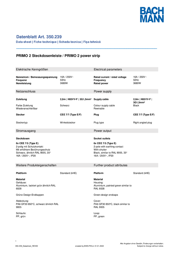 Listwa zasilająca Bachmann 350239 350239 Ilość gniazdek: 6