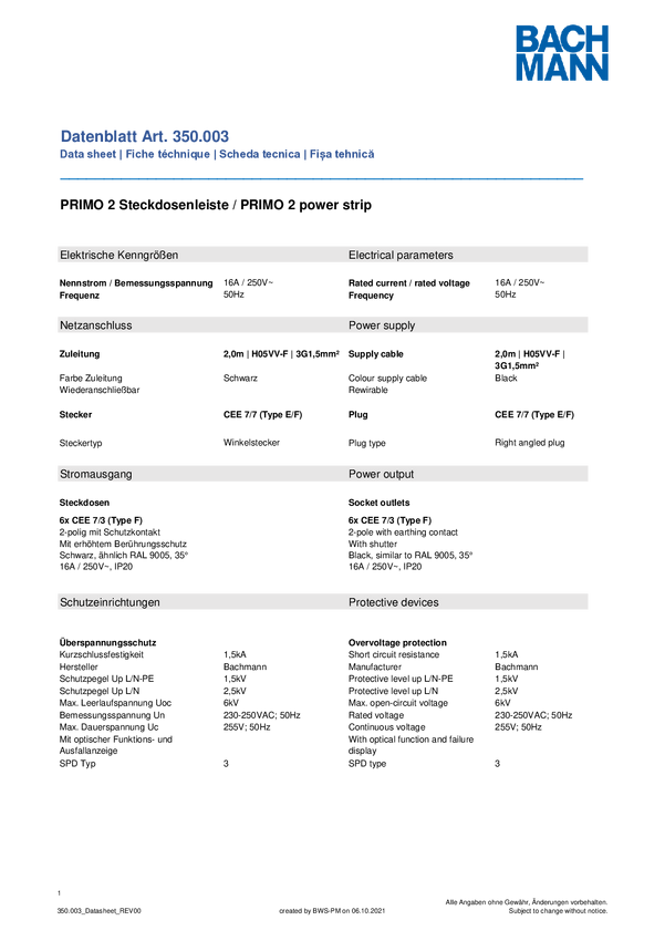 Listwa zasilająca Bachmann 350003 350003 Ilość gniazdek: 6