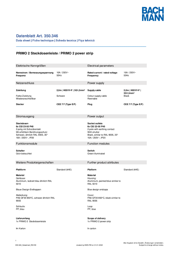 Listwa zasilająca Bachmann 350346 350346 Ilość gniazdek: 6