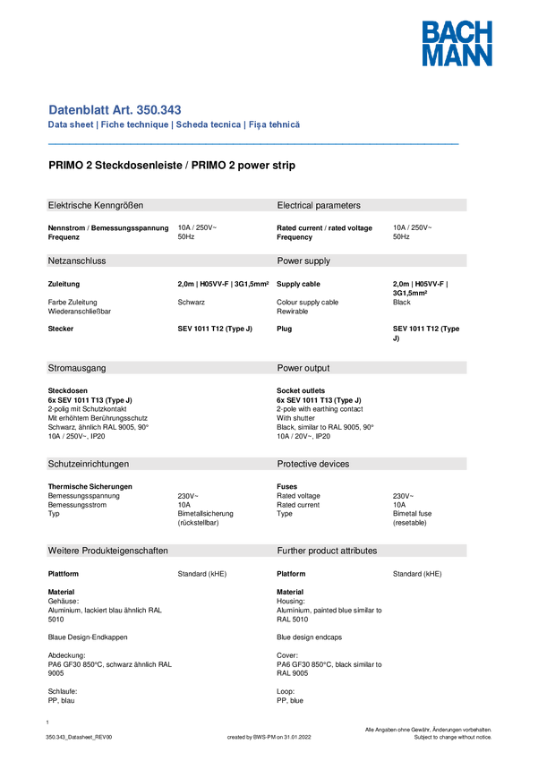 Listwa zasilająca Bachmann 350343 350343 Ilość gniazdek: 6