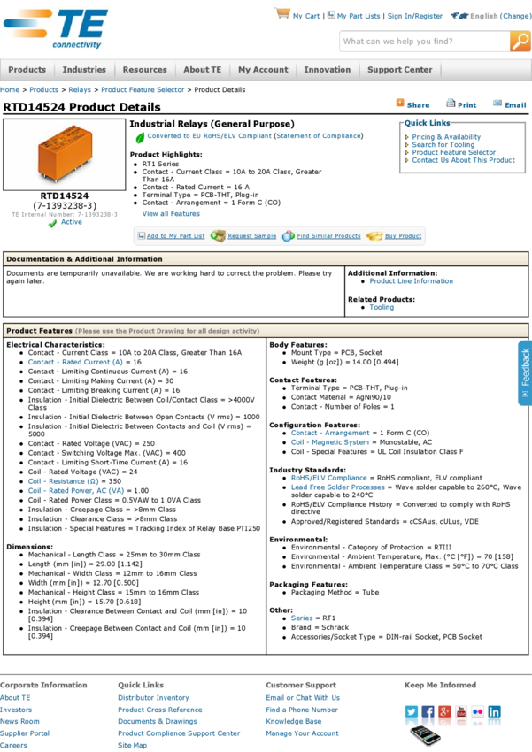Electromechanical Relay SPDT 16A 24VAC 350Ohm Through Hole