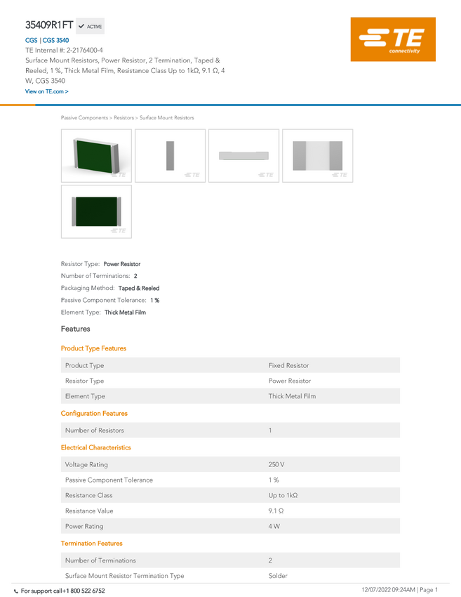TE Connectivity 2-2176400-4 9.1 Ω SMD 3540 0.01 % 1 szt. taśma na dużej rolce