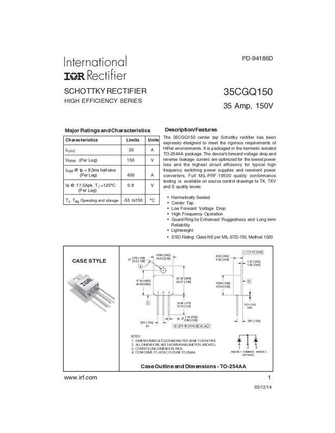 IR HiRel's 35CGQ150SCX is a 35A 150V common cathode configuration Schottky diode in a TO-254AA package. Optimized for the lowest power loss and highest circuit efficiency in high frequency switching power supplies and resonant power converters, along with JANTX level screening make this device reliable for space applications and other harsh environments.