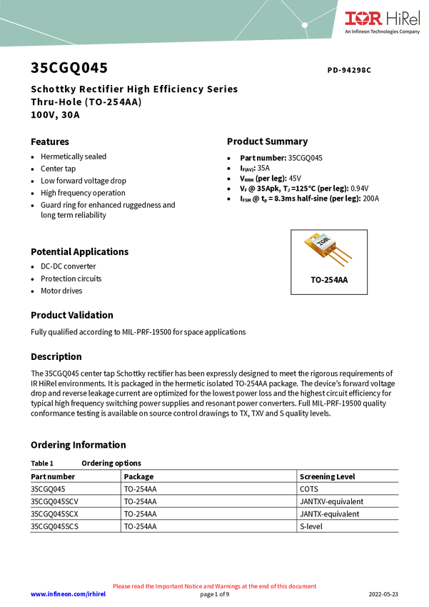 IR HiRel's 35CGQ045SCS is a 35A 45V common cathode configuration Schottky diode in a TO-254AA package. Optimized for the lowest power loss and highest circuit efficiency in high frequency switching power supplies and resonant power converters, along with JANS level screening make this device reliable for space applications and other harsh environments.