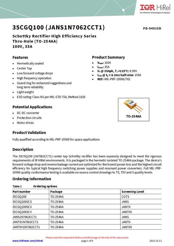 IR HiRel's JANTXV1N7062CCT1 is a 35A 100V common cathode configuration Schottky diode in a TO-254AA package. Optimized for the lowest power loss and highest circuit efficiency in high frequency switching power supplies and resonant power converters, these diodes are reliable for space applications and other harsh environments. This device is QPL qualified and its DLA number is 1N7062CCT1.