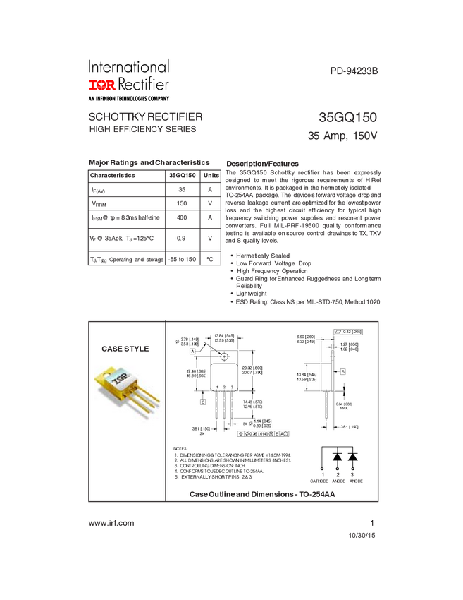 IR HiRel's 35GQ150SCVA is a 35A 150V single device configuration Schottky diode in a TO-254AA package, lead form down. Optimized for the lowest power loss and highest circuit efficiency in high frequency switching power supplies and resonant power converters, along with JANTXV level screening make this device reliable for space applications and other harsh environments.
