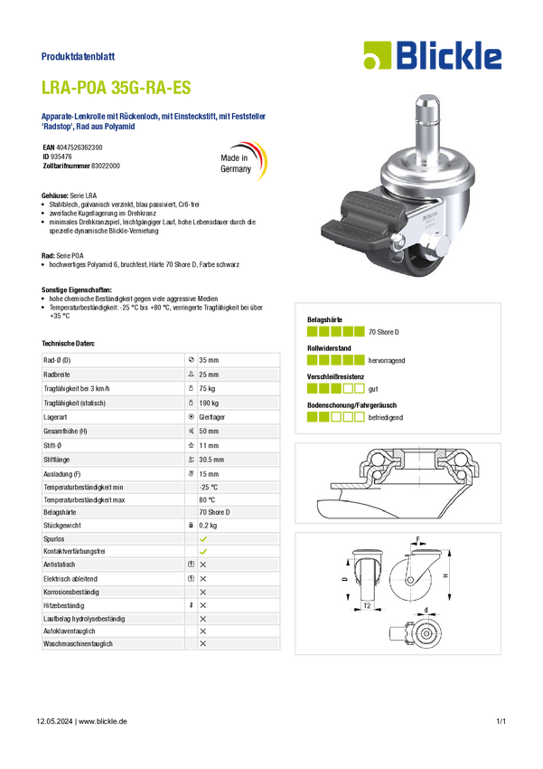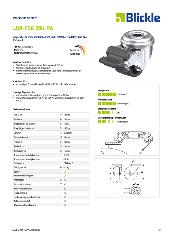 Blickle 935476 LRA-POA 35G-RA-ES Rolka do urządzenia Średnica koła: 35 mm Maksymalne obciążenie: 75 kg 1 szt.