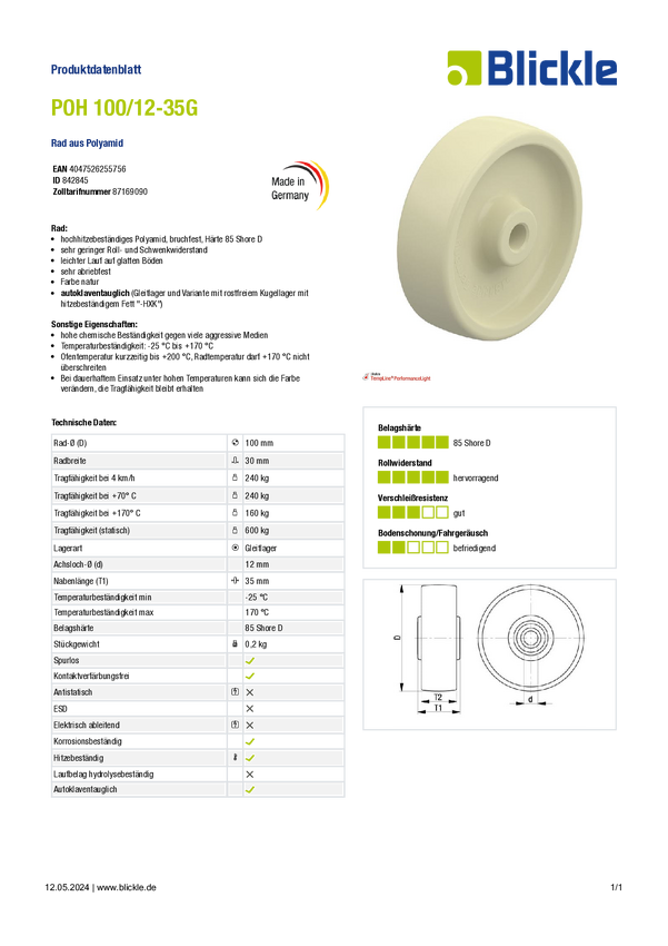 Blickle 842845 POH 100/12-35G Koło Średnica koła: 100 mm Maksymalne obciążenie: 240 kg 1 szt.