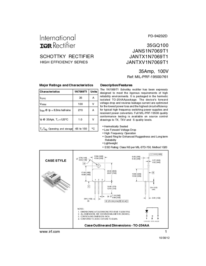 IR HiRel's JANS1N7069T1 is a 35A 100V common cathode configuration Schottky diode in a TO-254AA package. Optimized for the lowest power loss and highest circuit efficiency in high frequency switching power supplies and resonant power converters, these diodes are reliable for space applications and other harsh environments. This device is QPL qualified and its DLA number is 1N7069T1.