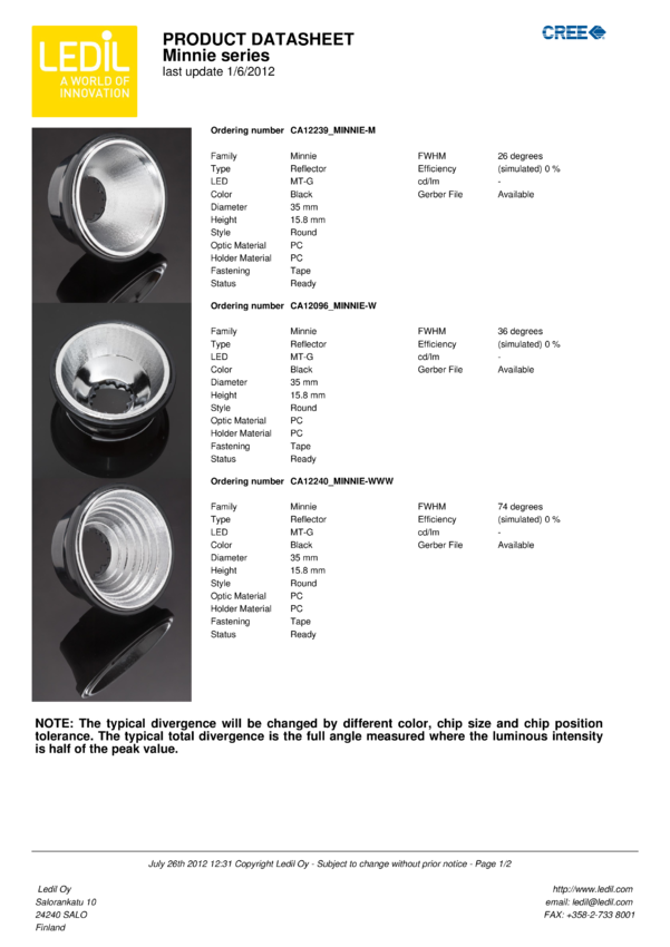 Reflektor MINNIE , Medium, , do diod LED High Power CREE seria MTG, średnica 35mm, wysokość 15,8mm, czarny holder, taśma samoklejąca, Ledil