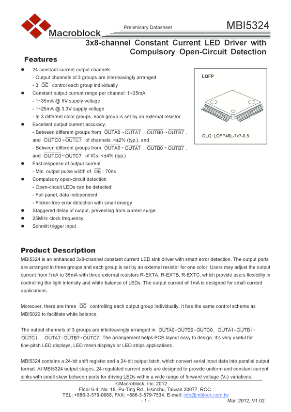 3x8-kanałowy sterownik LED, prąd stały, z obowiązkowym wykrywania otwartego obwodu, Iout- 1-35mA /na kanał, Vout=17V, LQFP48;