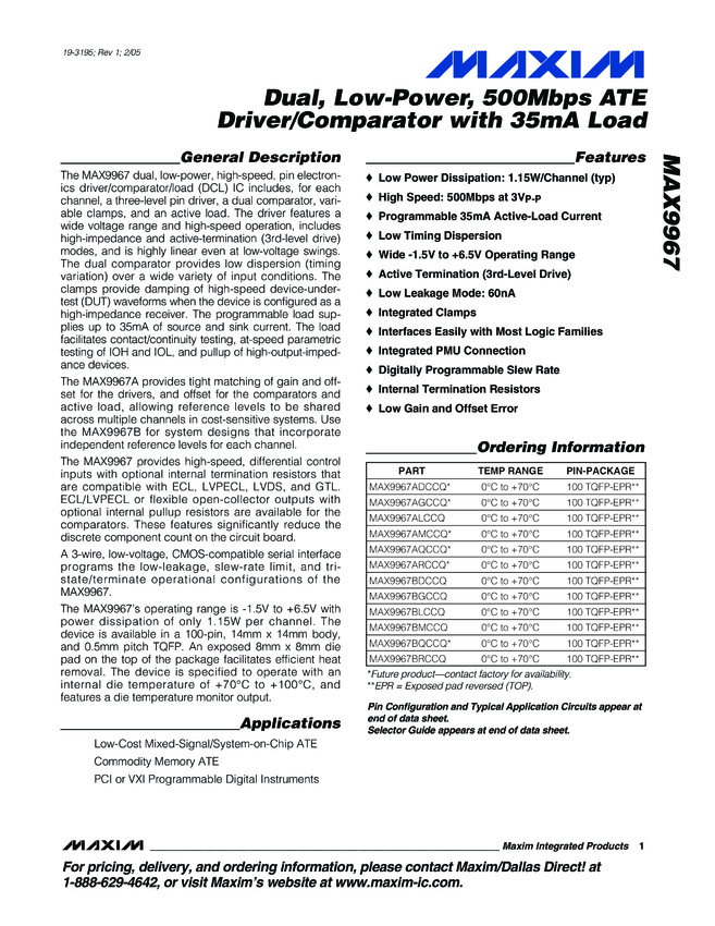 MAX9967 Dual, Low-Power, 500Mbps ATE Driver/Comparator with 35mA Load