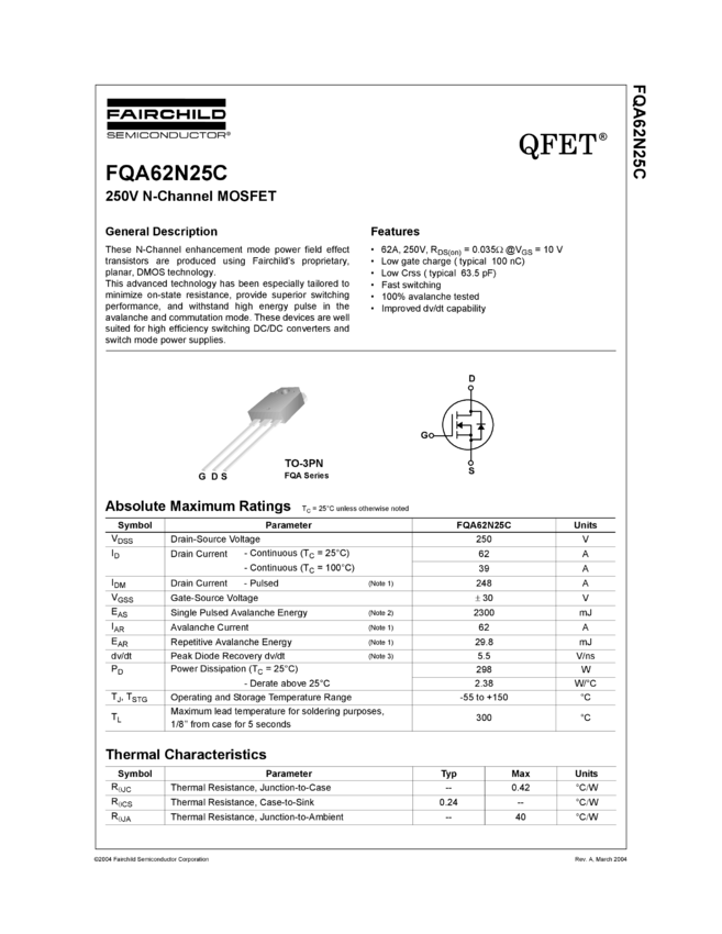 N-Channel QFET<sup>®</sup> MOSFET 250V, 62A, 35mΩ