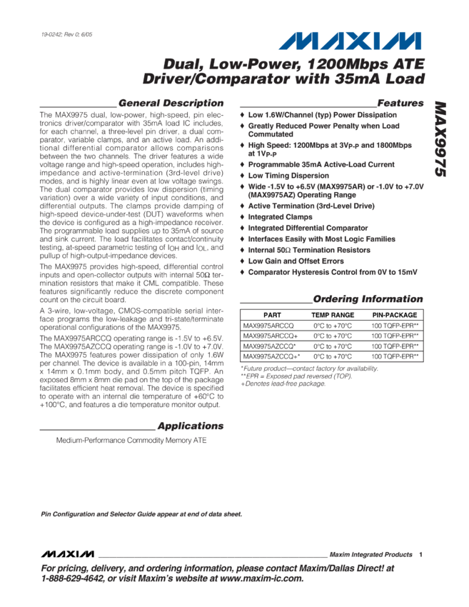 MAX9975 Dual, Low-Power, 1200Mbps ATE Driver/Comparator with 35mA Load