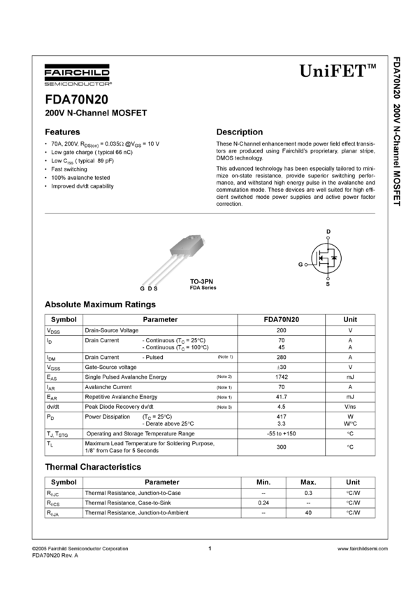 N-Channel UniFET<sup>TM</sup> MOSFET 200V, 70A, 35mΩ