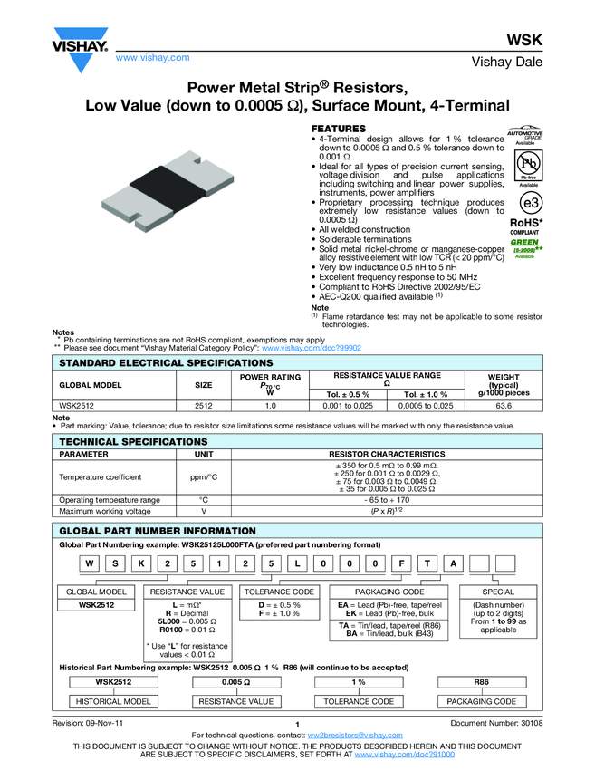 Res Metal Strip 2512 0.02 Ohm 1% 1W ±35ppm/°C Molded SMD SMD T/R