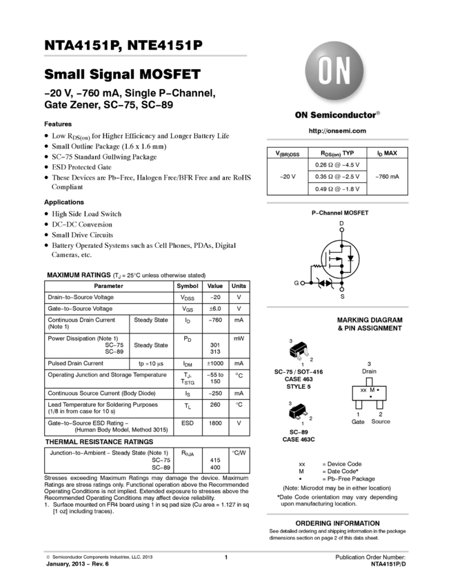 Small Signal MOSFET -20V -760mA 360 mOhm Single P-Channel SC-75 with ESD Protection
