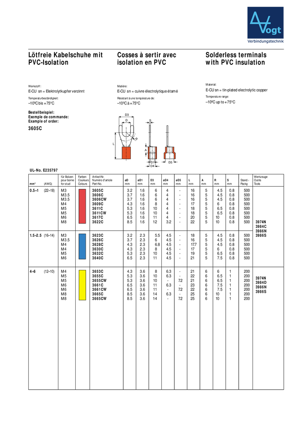 Końcówka kablowa widełkowa 3605C, 1.5-2.5 mm2, O 6.5 mm, M3, czerwona