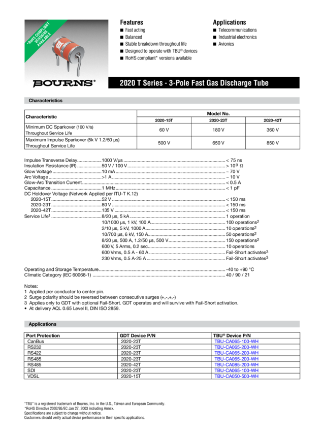 Surge Arrestor 3-Electrode Miniature Gas Discharge Tube 360VDC 10kA Thru-Hole Tray