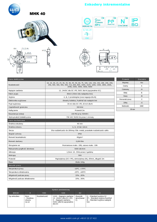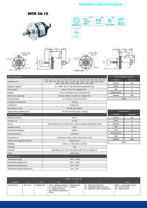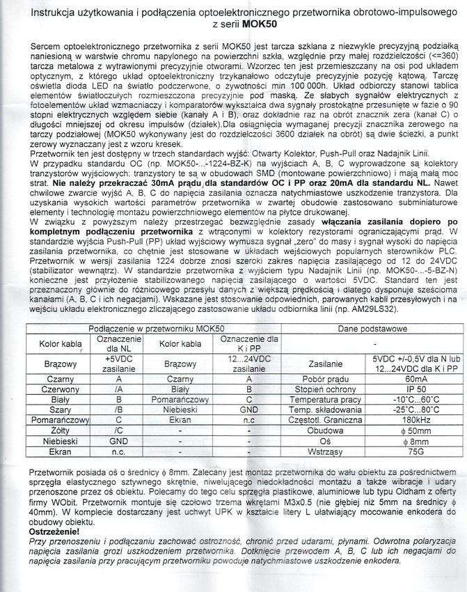 Enkoder optyczny śr.40mm oś 6mm/15mm rozdzielczość CPR Zasilanie 12-24V; wyjścia ABC, OK,IP50; Opisy, karty katalogowe, ceny na zapytanie MOK40-1000-24-K