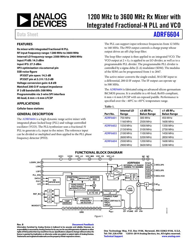 1200 MH TO 3600 MH Rx Mixer with Integrated Fractional-N PLL and VCO