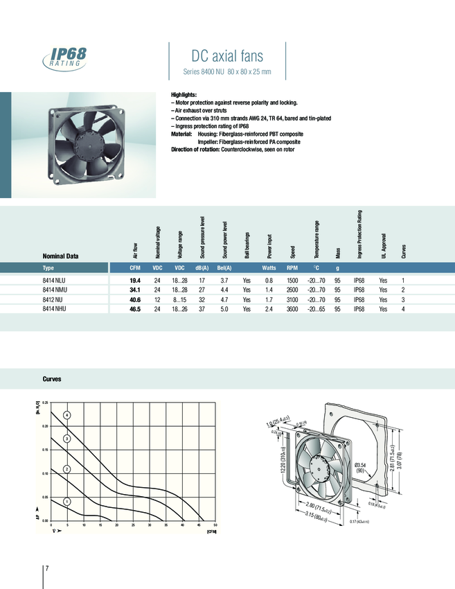 Fan,Axial,24VDC,80x80x25mm,46.5cfm,2.4W,3600rpm,Ball Bearing,IP68
