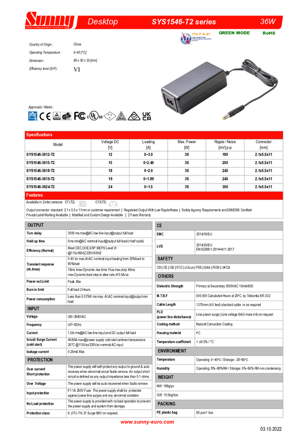Zasilacz desktop SUNNY 24V 1,5A 36W | SYS1546-3624-T2