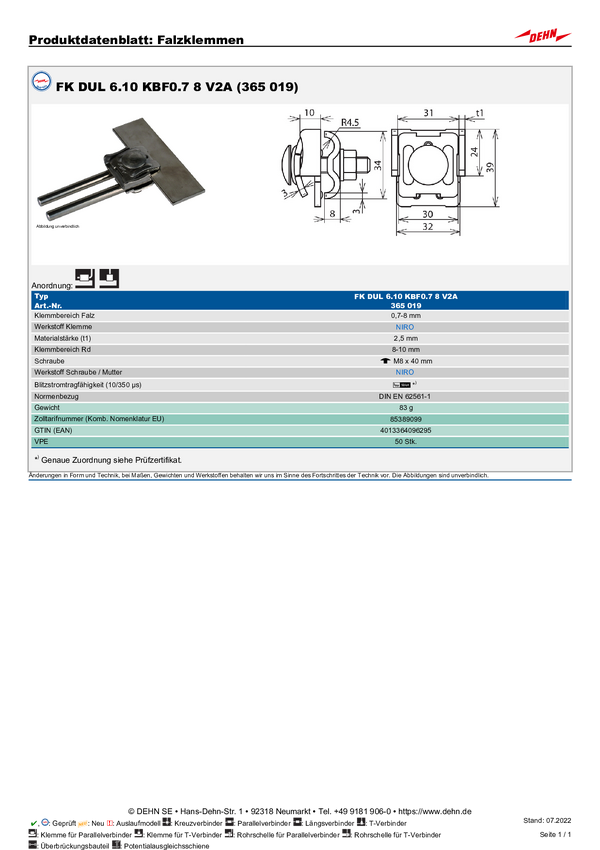 DEHN 365019 FK DUL 6.10 KBF0.7 8 V2A Akcesorium montażowe 1 szt.