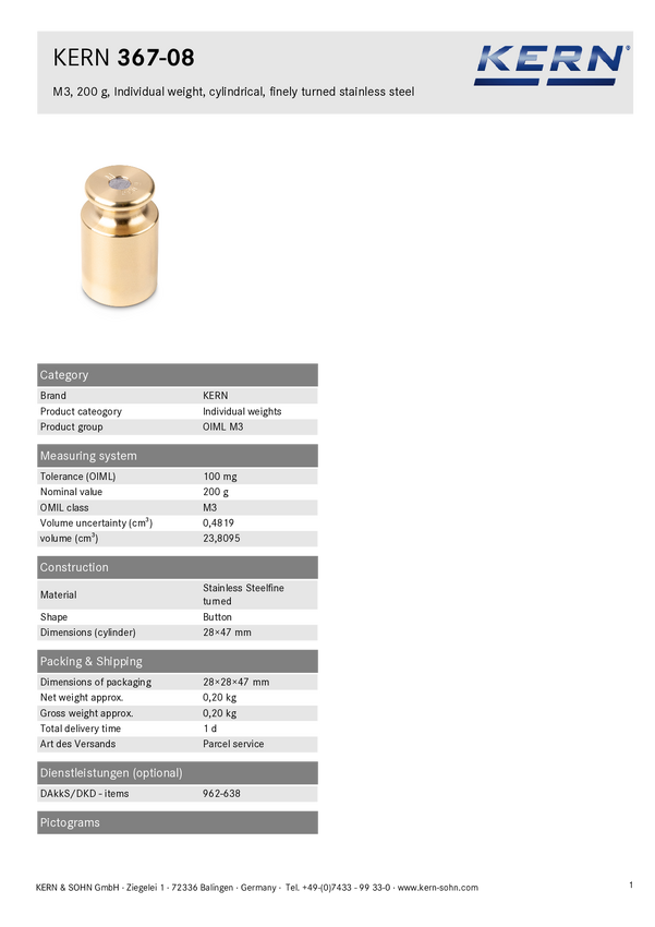 Odważnik do kalibrowania wag Kern 367-08 367-08