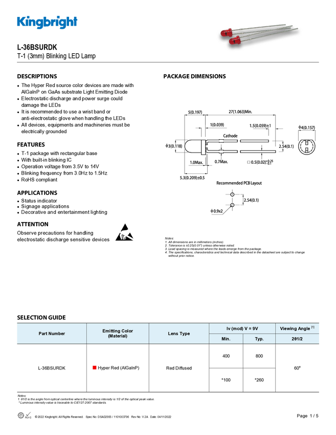 Dioda LED THT Kingbright L-36BSURDK L-36BSURDK, 3 mm, 800 mcd, 1 szt.