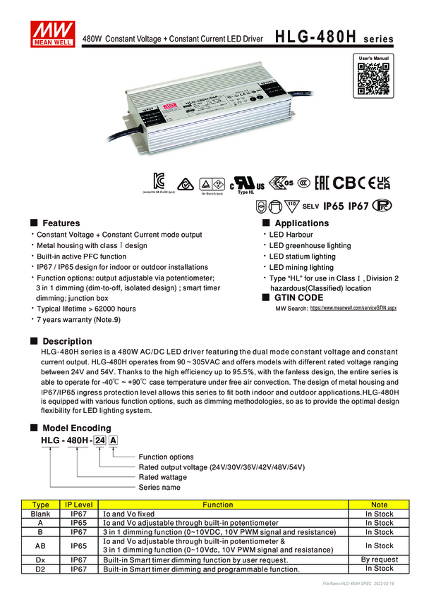 MEAN WELL HLG-480H-36B Sterownik LED Stałonapięciowy, Stałonaprądowy 478.8 W 13.3 A 18 - 36 V/DC Funkcja ściemniania 3 w