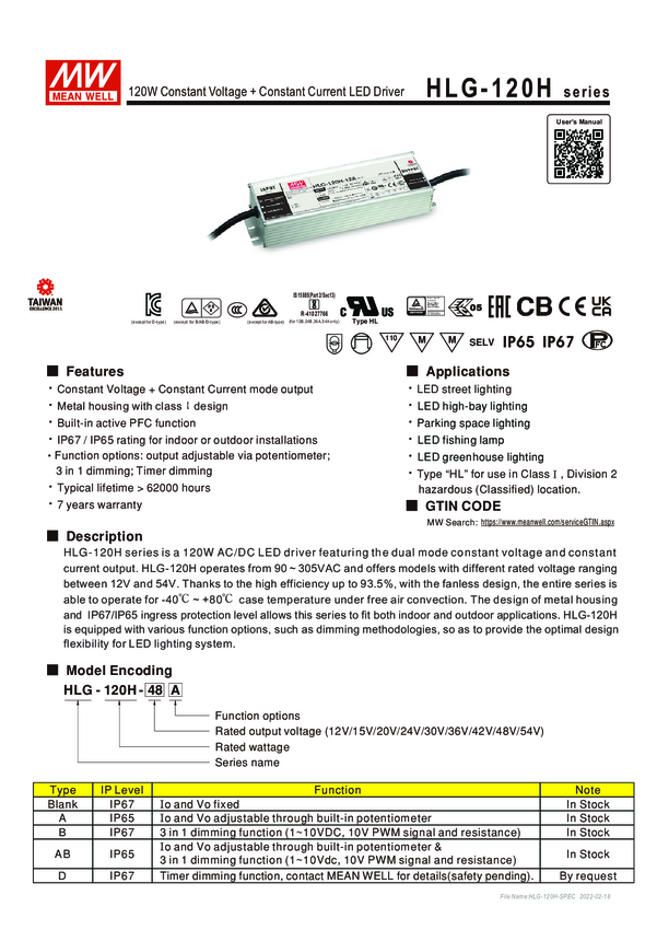 MEAN WELL HLG-120H-36B Sterownik LED, Transformator LED Stałonapięciowy, Stałonaprądowy 122 W 3.4 A 18 - 36 V/DC Ściemni