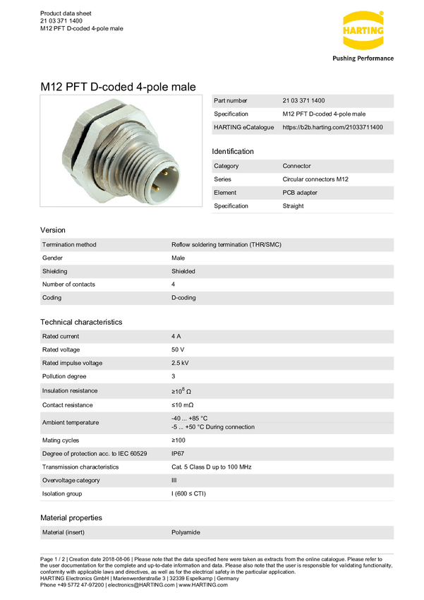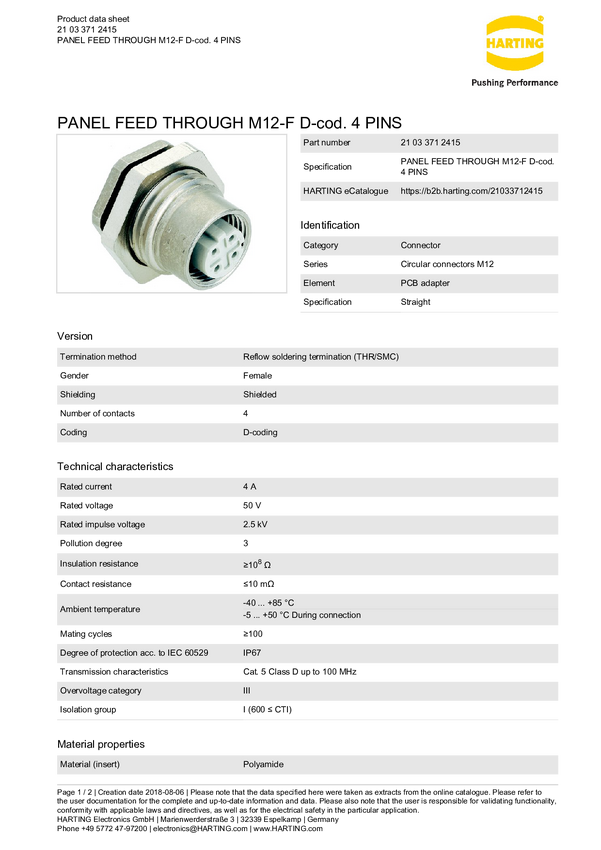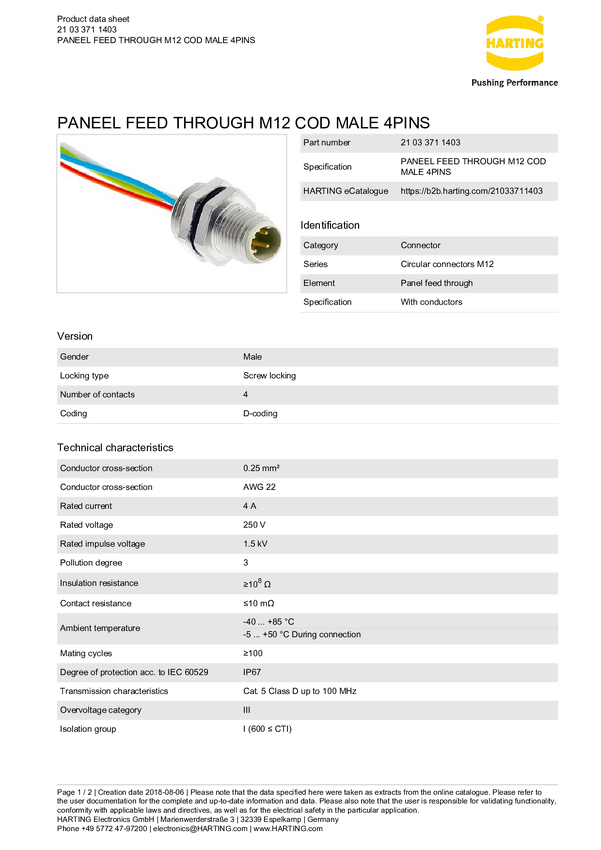 Przepust ścienny Harting 21 03 371 1403, 250 V, 4 A, 1 szt.
