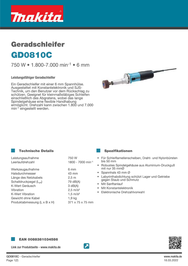 Szlifierka prosta Makita S_0380_2566809 GD0810C 371 mm 1 szt.