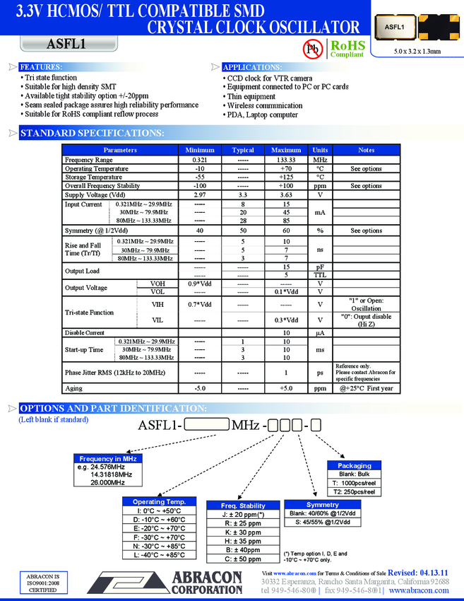 Clock Oscillator 27MHz 15pF ±50ppm 4-Pin QFN T/R