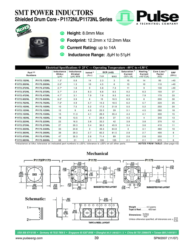 Ind Power Shielded Wirewound 1.3uH 30% 100KHz 14A T/R