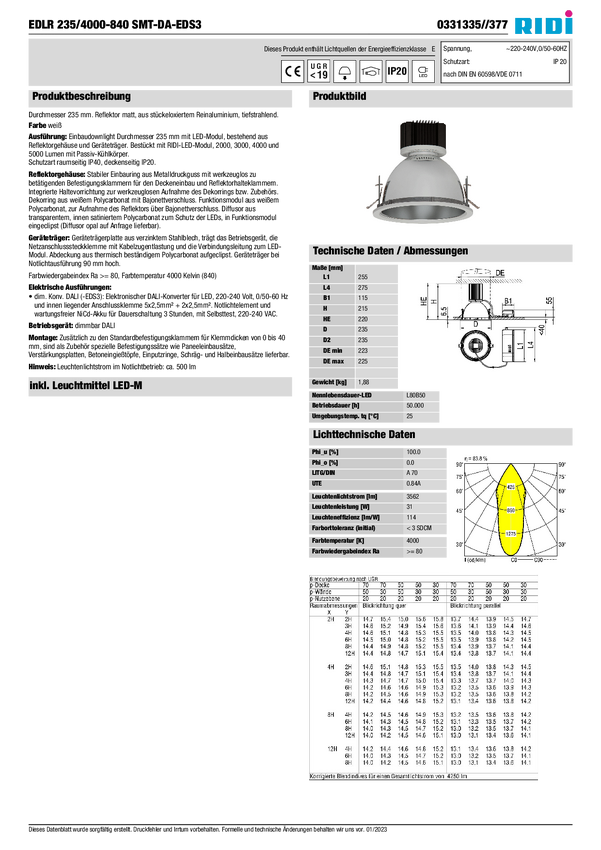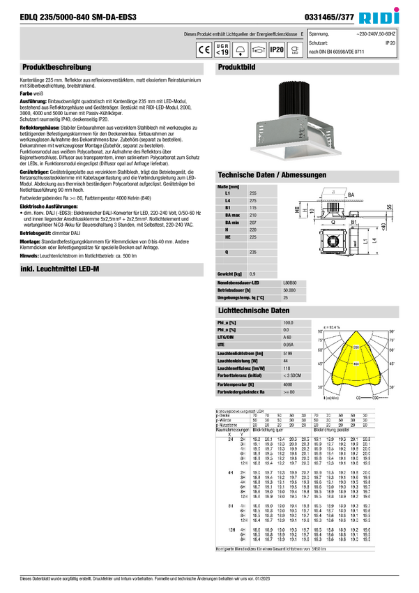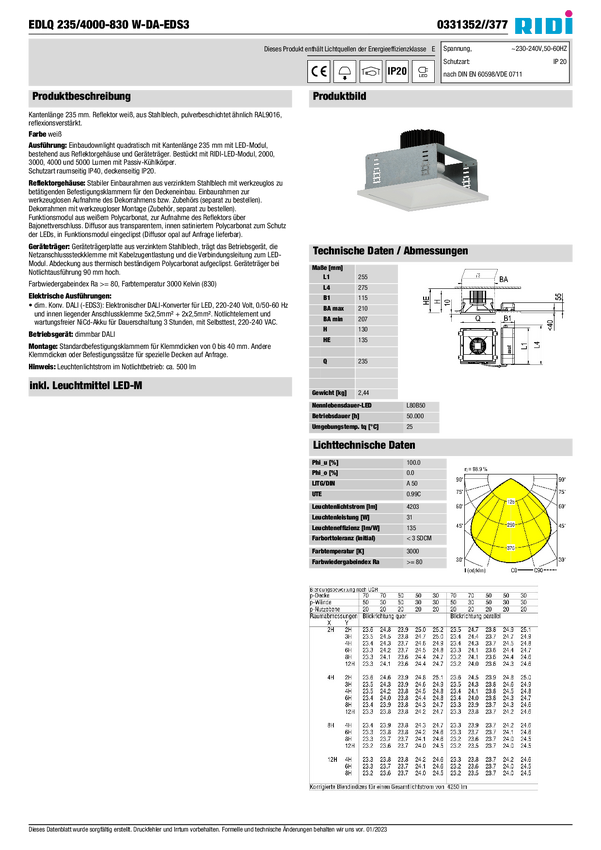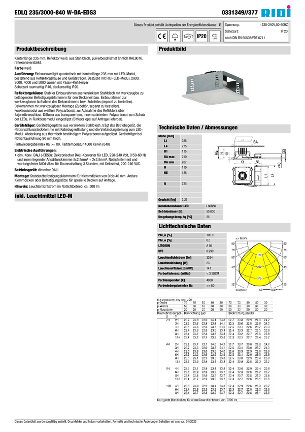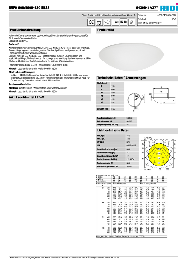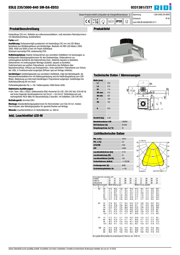 Oświetlenie wewnętrzne LED RIDI 0331350//377 0331350//377 23 W 3260 lm