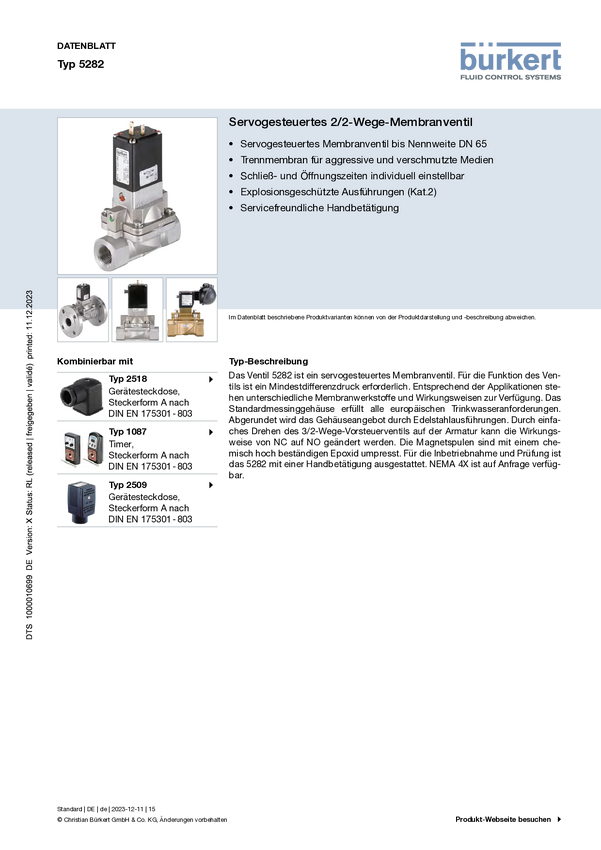 Serwozawór sterowany Bürkert 5282 382749, 0.2 bar (max)