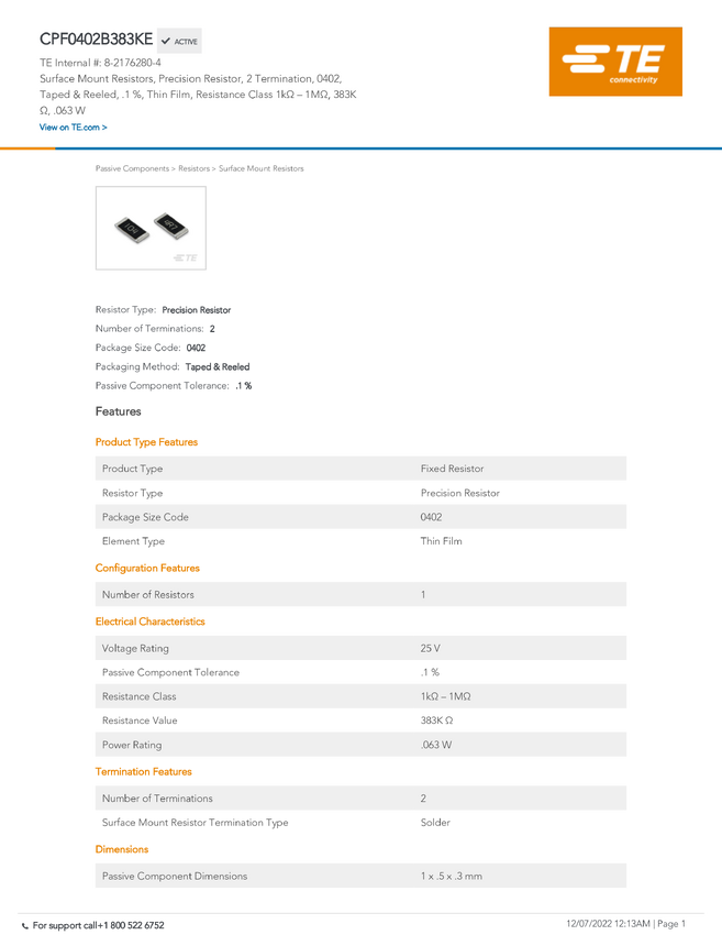 TE Connectivity 8-2176280-4 Rezystor precyzyjny 383 kΩ SMD 0402 0.1 % 25 ppm 1 szt. taśma na dużej rolce