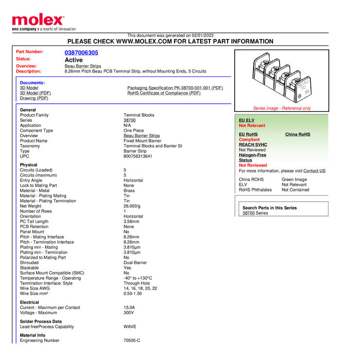 Molex 387006305 Terminal PCB Ilość styków 5 1 szt.