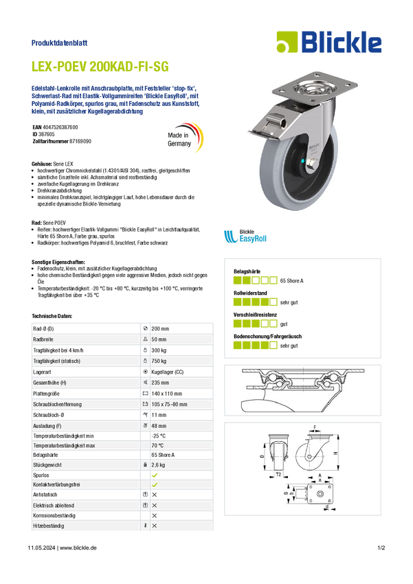Kółko Blickle LEX-POEV 200KD-SG-FI, obrotowe, z hamulcem, średnica: 200 mm