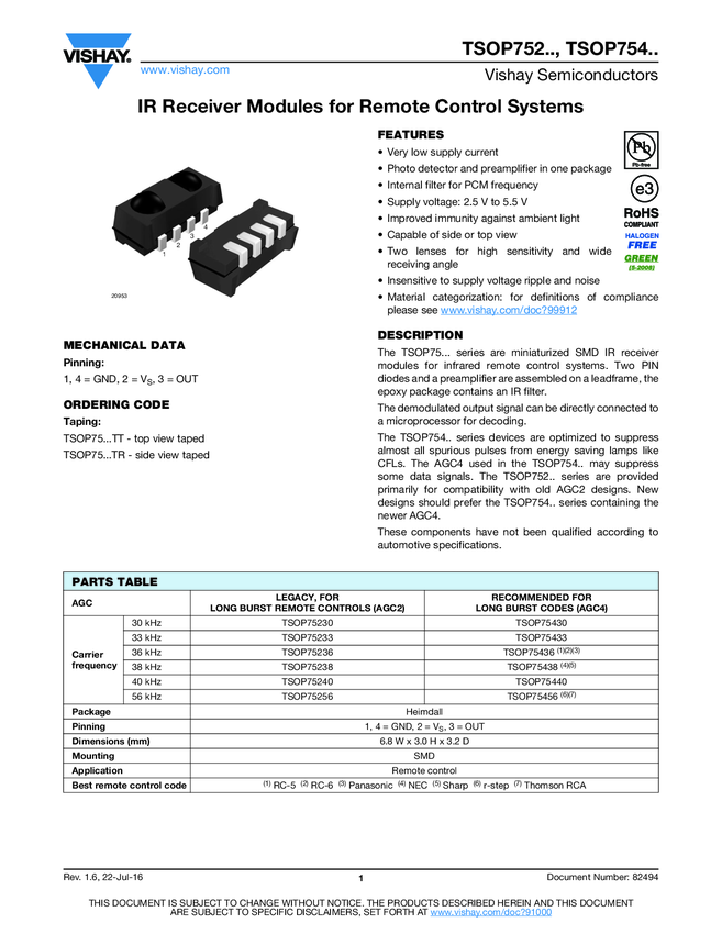 IR Remote Receiver 38KHz 45m 4-Pin SMD T/R