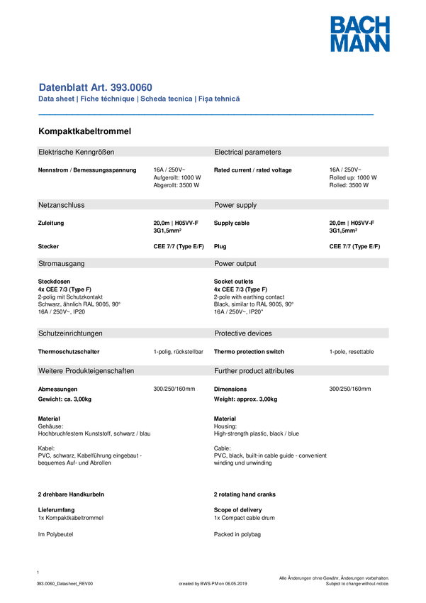 Bęben kablowy Bachmann 3930060 393.0060 20.00 m