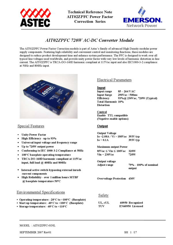 AC/DC Power Supply Single-OUT 393V 2.1A 720W 13-Pin 3/4-Brick