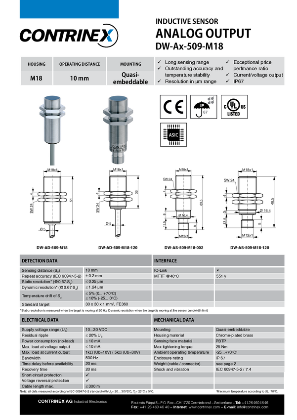 Czujnik indukcyjny Contrinex DW-AS-509-M18-120, 10 - 30 V, IP67, 1 szt.