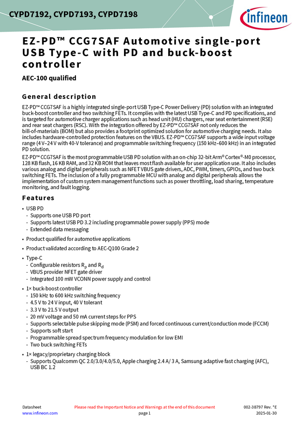 Optimized USB-C PD solution for multi-port head unit chargers in automotive applications EZ-PD™ CCG7SAF is a highly integrated USB Type-C Power Delivery solution for automotive applications, featuring a buck-boost controller, 2 FETs, and a 32-bit Arm® Cortex®-M0 processor enabling custom system management functions like power throttling and temperature monitoring.